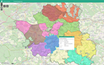 In der Karte sind die Grenzen der Schornsteinfegerbezirke eingezeichnet. Durch Klicken auf einen Bezirk erhält man über den im Ergebnisfenster