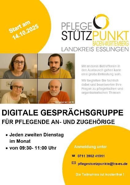 Die Gruppe trifft sich immer am zweiten Dienstag im Monat, beginnend am 14. Oktober 2025 von 9.30 Uhr bis 11 Uhr online. Teilnehmen können An- und Zugehörige aus dem Landkreis Esslingen, die sich mit anderen Betroffenen austauschen möchten. Im Mittelpunkt stehen der offene Dialog, das Teilen von Erfahrungen und die Möglichkeit, Fragen aus dem Pflegealltag zu stellen und praxisnahe Tipps zu erhalten.