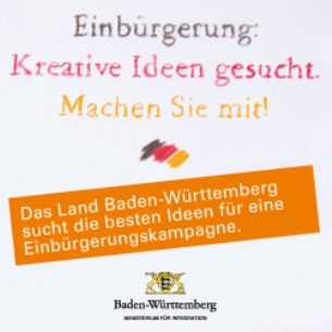 Die Ministerin für Integration, Bilkay Öney, und die Staatsrätin für Zivilgesellschaft und Bürgerbeteiligung, Gisela Erler, haben am 11. Juni 2012 einen Ideenwettbewerb gestartet, der zugleich Auftakt für eine Einbürgerungskampagne in Baden-Württemberg ist. „Unser Gedanke dabei: Die Kampagne soll nicht allein von Medienprofis gemacht werden, sondern wir setzen hier auch auf den Ideenreichtum unserer Bürgerinnen und Bürger“, so Öney und Erler.